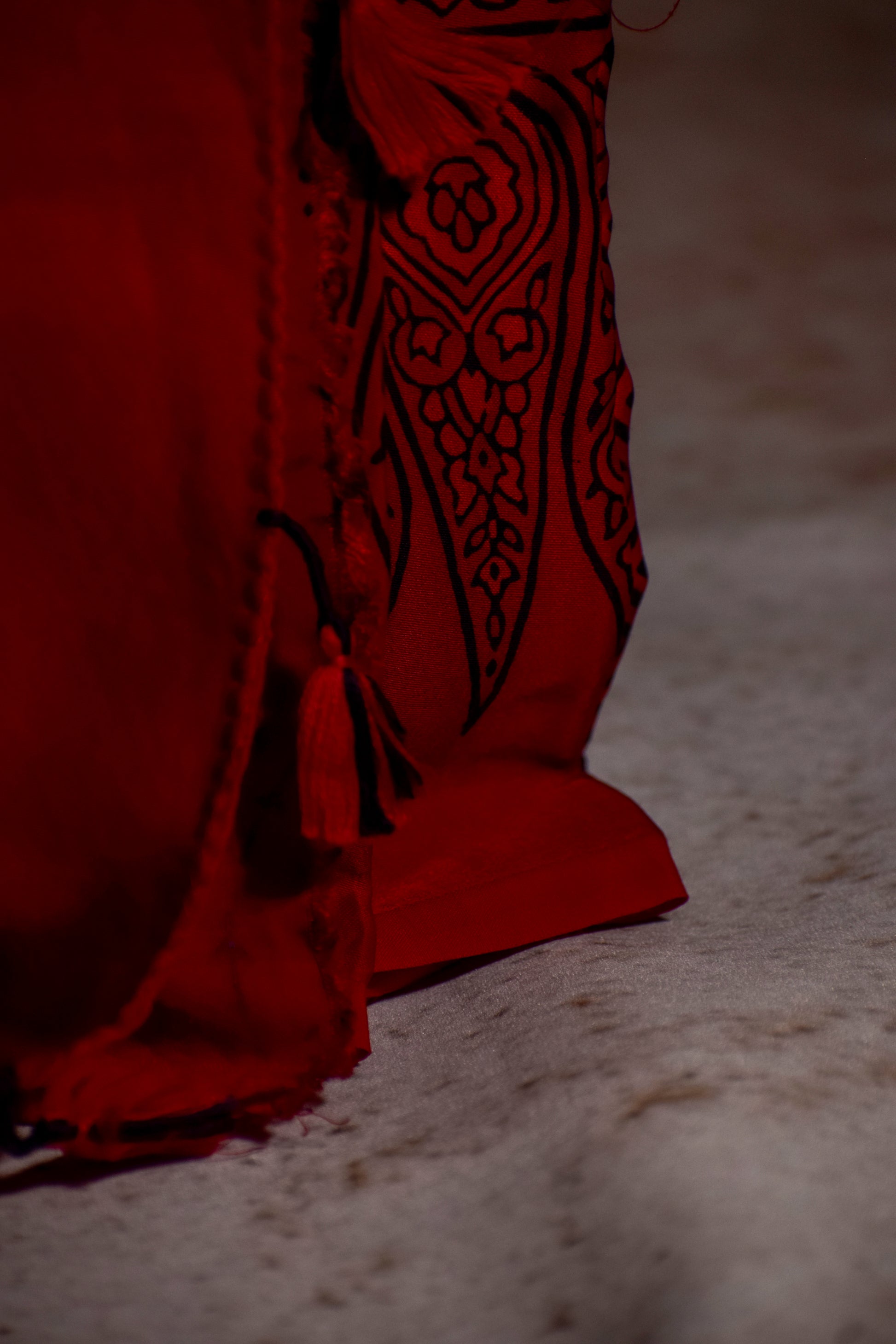 A blend of heritage and fine craftsmanship, this Red Ajrakh Saree is crafted from premium modal silk for a soft, fluid drape. Featuring intricate handpainted Ajrakh motifs, it showcases the timeless beauty of traditional block printing with a contemporary artistic touch.