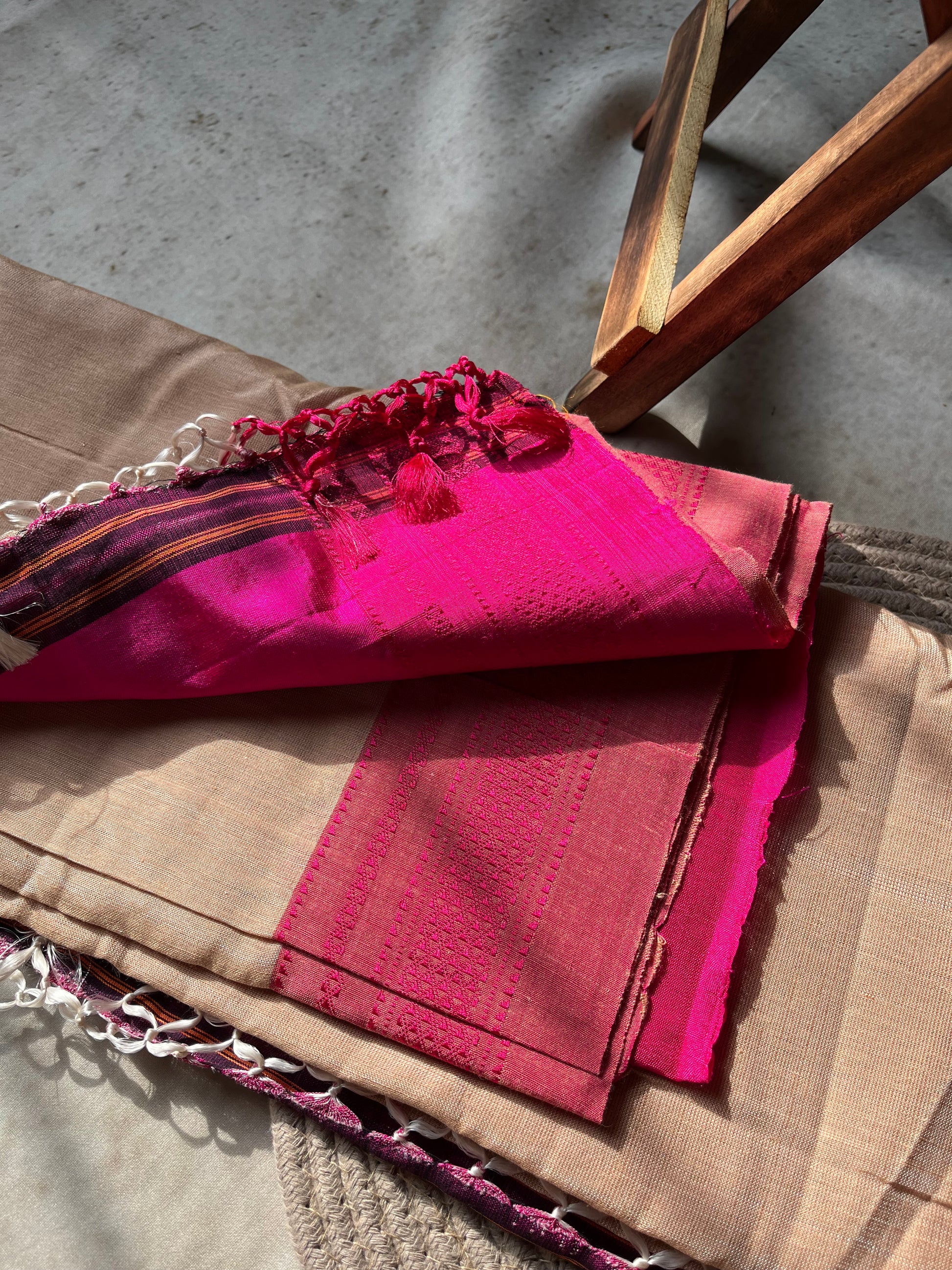 A blend of tradition and elegance, this beige Ilkal Saree is handwoven from soft viscose by cotton for a comfortable, airy drape. Featuring the classic chikki border, it reflects the rich heritage of Ilkal weaving.